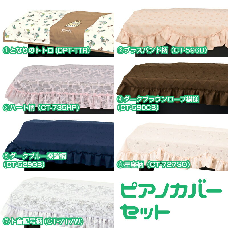 大切なデジタルピアノをほこりや汚れから守りたい!とお考えの方おすすめです! 可愛いピアノカバーのセットを御用意致しました! 数種類の中からお好きな柄を選ぶことが出来ます! 1・トトロ(DPT-TTR) 2・ブラスバンド柄(CT-596BB) 3・ハート柄(CT-735HP) 4・ダークブラウンロープ模様(CT-590CB) 5・ダークブルー楽譜柄(CT-529GB) 6・星座柄(CT-727SO) 7・ト音記号柄(CT-717W) ※お好きな柄のカバーを選べます。